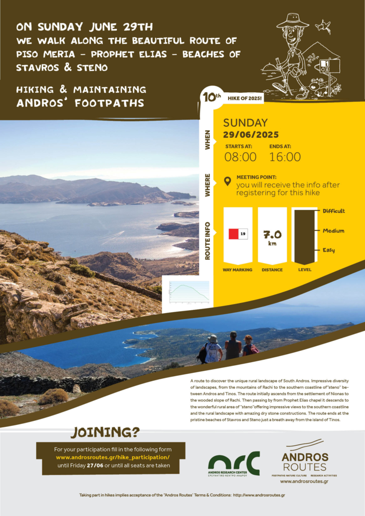 Taking part in hikes implies acceptance of the Andros Routes terms & conditions https://www.androsroutes.gr/hike_advice_roules/