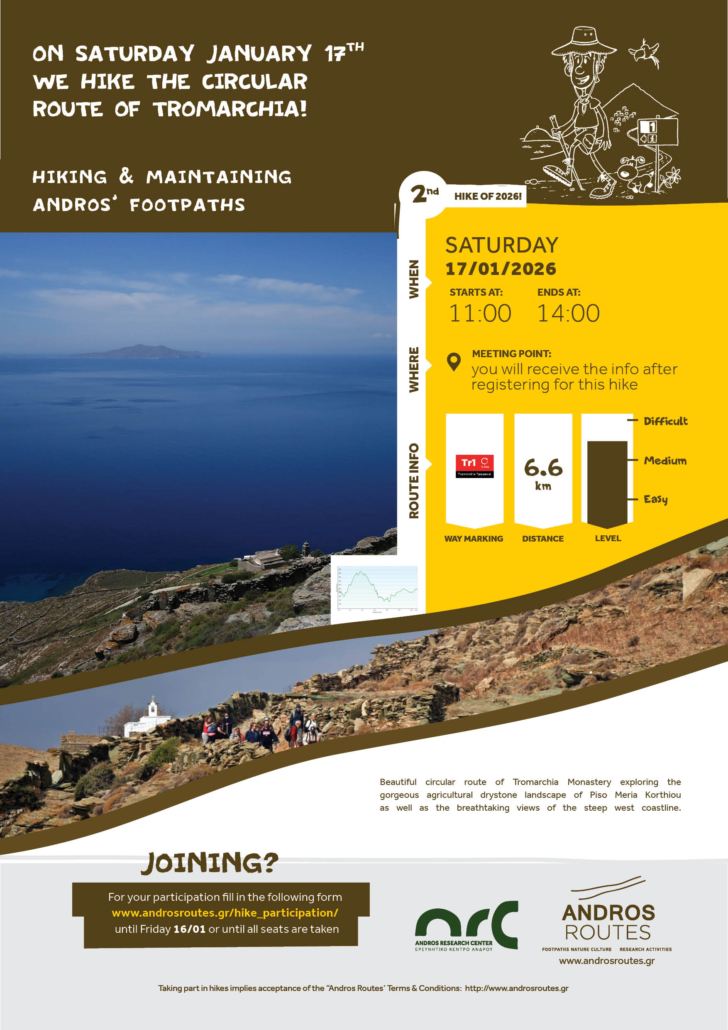 Taking part in hikes implies acceptance of the Andros Routes terms & conditions https://www.androsroutes.gr/hike_advice_roules/