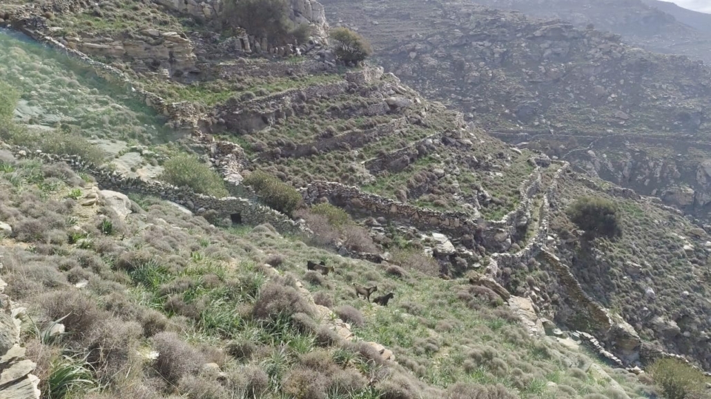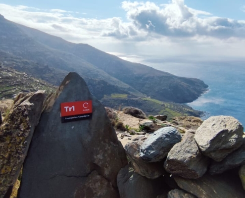 Ακολουθήσαμε τη διαδρομή με σήμανση Tr1 με νότια κατεύθυνση, η οποία διασχίζει το αγροτικό τοπίο της περιοχής με τις εντυπωσιακές ξερολιθιές και τις στενές. Όσο προχωρούσαμε, η θέα της απόκρημνης και ξηρής δυτικής ακτής γινόταν όλο και πιο καθηλωτική.