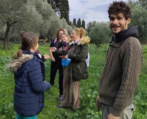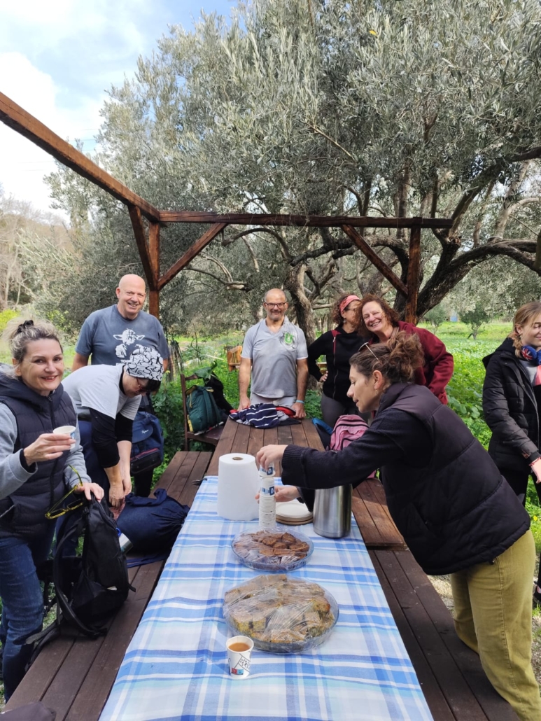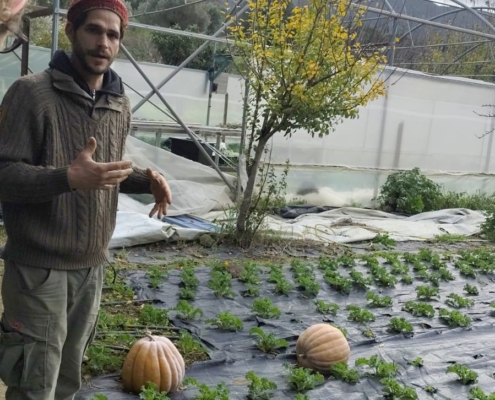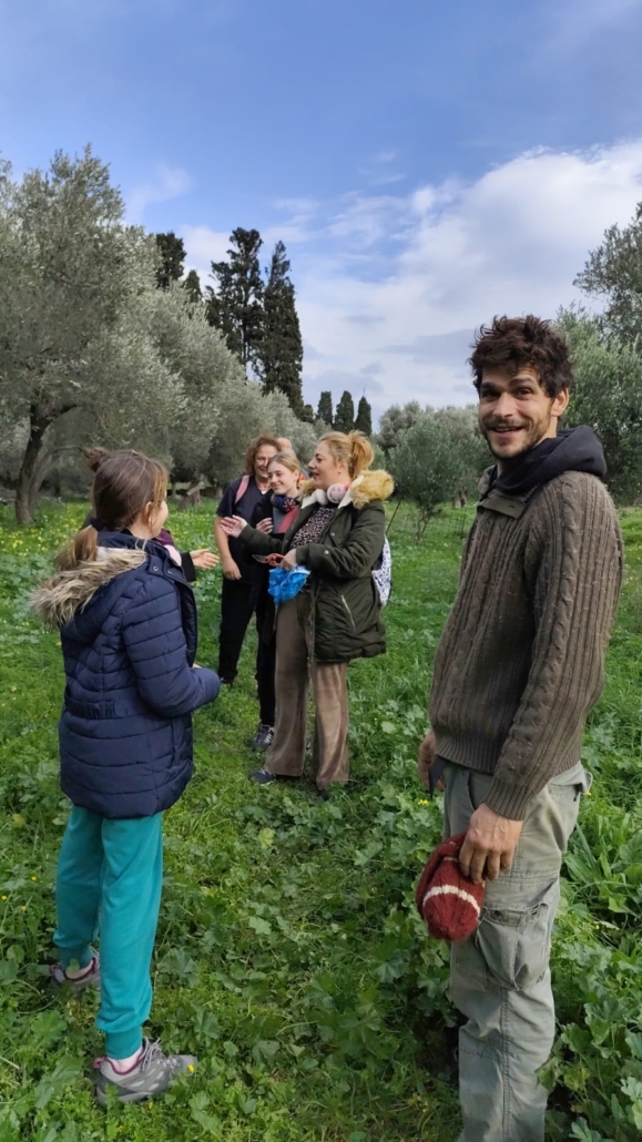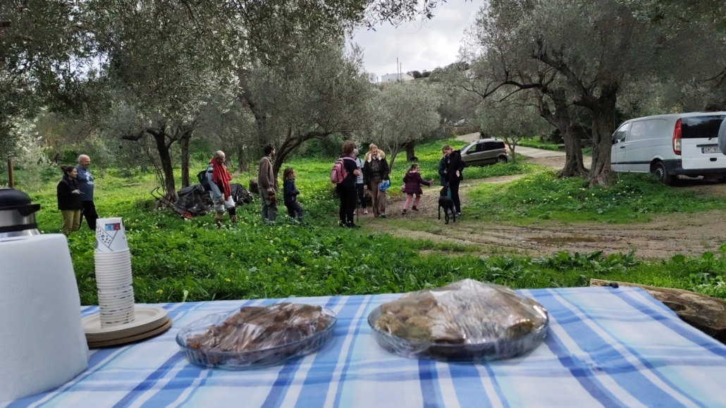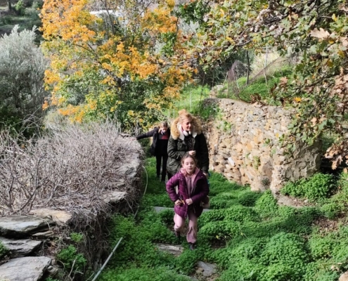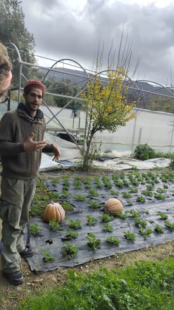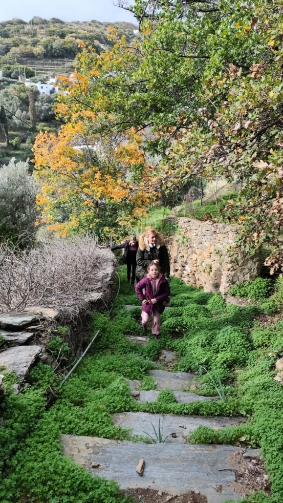 Κάναμε ένα σύντομο διάλειμμα στη Ράουσα και στη συνέχεια αποκλίναμε από τη διαδρομή 1 και, ακολουθώντας ένα τοπικό μη σηματοδοτημένο μονοπάτι, κατηφορίσαμε με προορισμό το φυσικό αγρόκτημα Λειβάδα. Εκεί μας υποδέχτηκαν οι πάντα φιλόξενοι Αλέξανδρος και Δήμητρα προσφέροντάς μας σπιτική κολοκυθόπιτα και ζεστό κακάο. Ο Αλέξανδρος μας ξενάγησε στο αγρόκτημα και μας μίλησε για τις φυσικές μεθόδους καλλιέργειας, με σεβασμό στο περιβάλλον και τη φύση. Έπειτα, είχαμε την ευκαιρία να συλλέξουμε λαχανικά και φρούτα από το αγρόκτημα, κάνοντας την εμπειρία μας ακόμη πιο βιωματική.