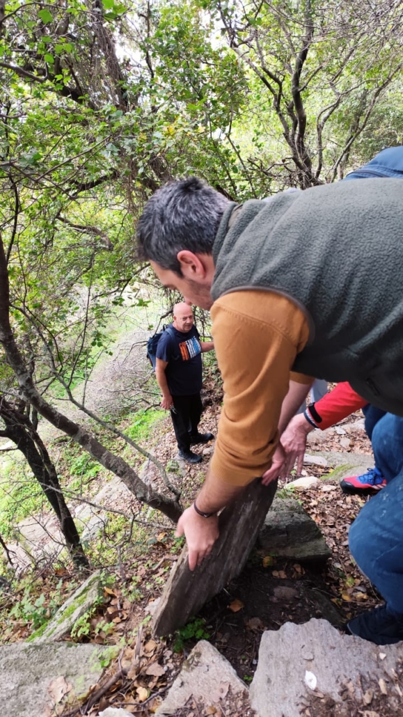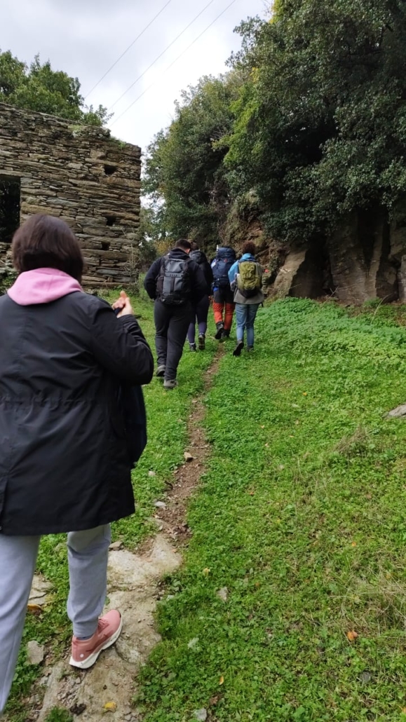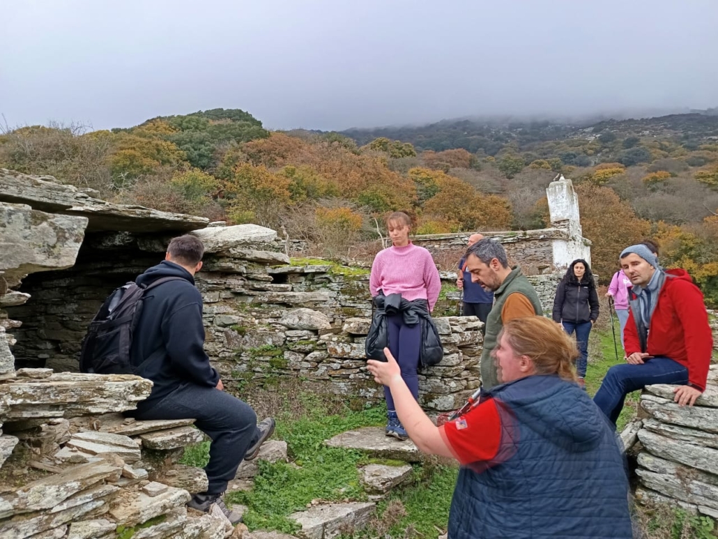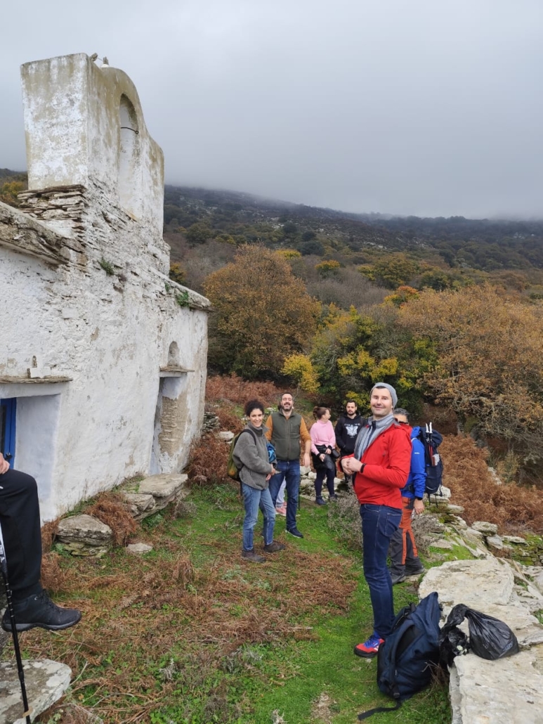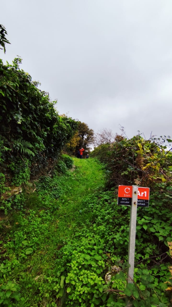 Αρχίσαμε να περπατάμε κάτω από ένα συννεφιασμένο ουρανό που όμως αναδείκνυε τα όμορφα χρώματα της φύσης γύρω μας. Αρχικά ακολουθήσαμε σύντομο τμήμα της διαδρομής 11 και περνώντας από την πηγή Μάζανη, οδηγηθήκαμε στην κυκλική διαδρομή της Άρνης που φέρει τη σήμανση Ar1. Στην συνέχεια, ανηφορήσαμε το όμορφο μονοπάτι μέσα στην βλάστηση μέχρι το εξωκλήσι του Άη Γιώργη. Εκεί πήραμε μια ανάσα και θαυμάσαμε τον ιδιαίτερο τρόπο κτισίματος των κελιών και γενικά των πέτρινων κτισμάτων στην περιοχή. Απολαύσαμε τη θέα προς το χωριό και βγάλαμε όλοι μαζί φωτογραφίες.