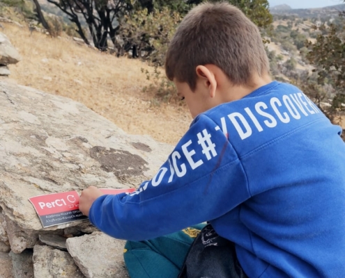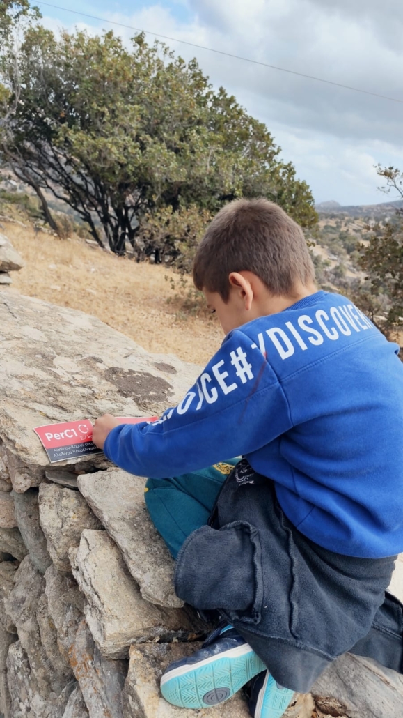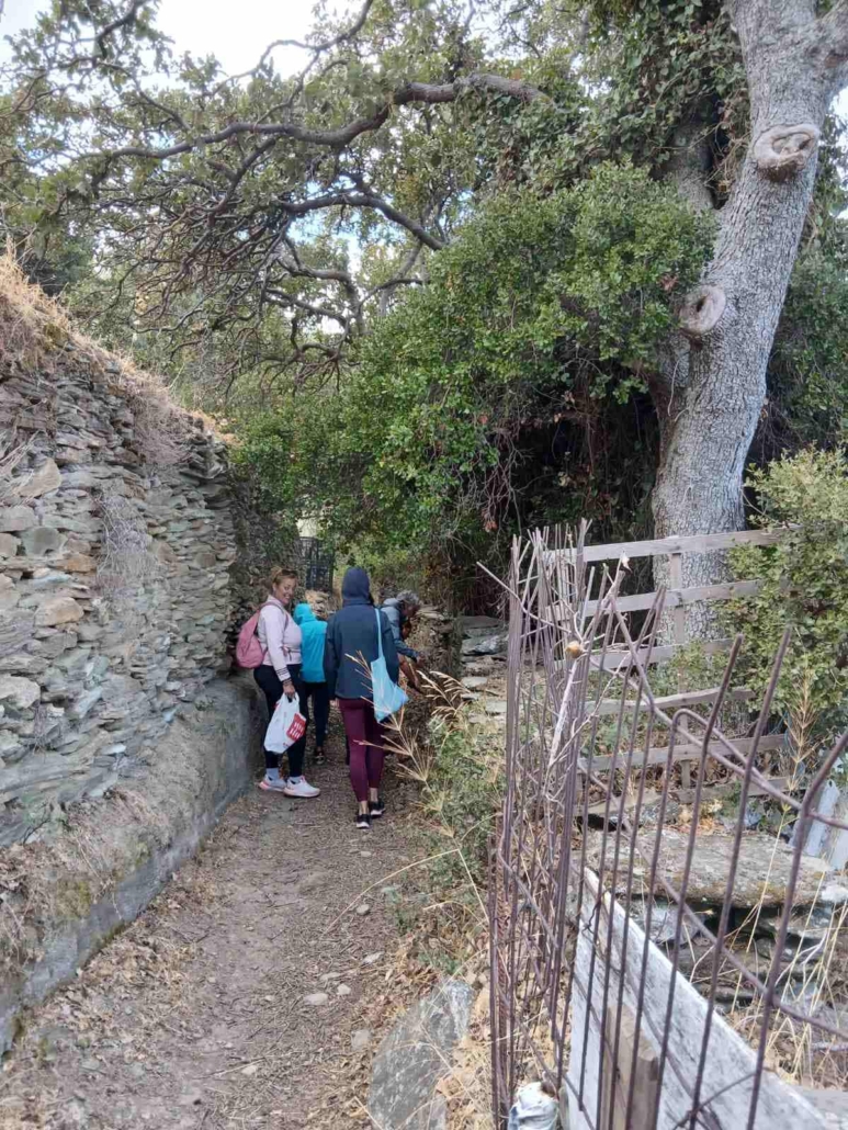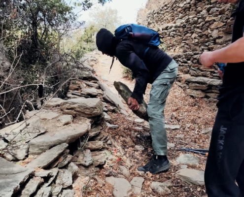 We began our hike with the youngest children leading the way, discovering the path signs and essentially guiding the group. Very soon, we turned onto route 18. As soon as we entered the path, our tools went to work: trimming overgrown vegetation, collecting litter, and replacing fallen stones on the dry stone walls. The children enthusiastically helped pick up trash, checked the path signs, and placed new ones where needed. We then continued via the Pera Choria 2 route (PerC2) to reach our target route, PerC1.