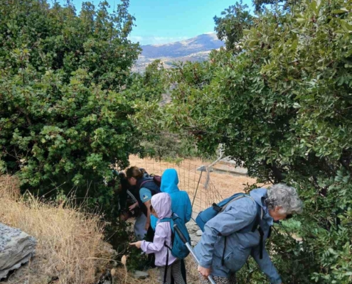 We then passed through Koureli and a ravine with structured irrigation channels that once directed water to the terraced fields. Along the way, we encountered the lovely old school of the Pera Choria, with its balcony-like courtyard, and learned that every Easter, locals play “tsounia” there — a game resembling bowling.